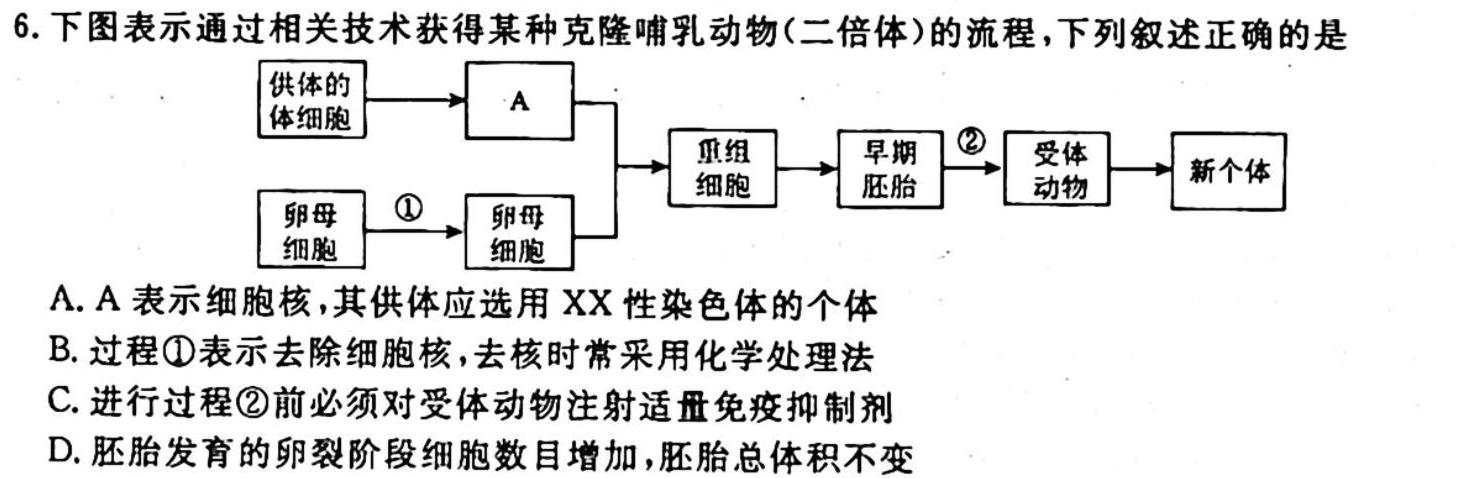 6.下图表示通过相关技术获得某种克隆哺乳动物(二倍体)的流程,下列叙述正确的是供体的A.A表示细胞核,其供体应选用XX性染色体的个体B.过程①表示去除细胞核,去核时常采用化学处理法C.进行过程②前必须对受体动物注射适册免疫抑制剂D.胚胎发育的卵裂阶段细胞数目增加,胚胎总体积不变