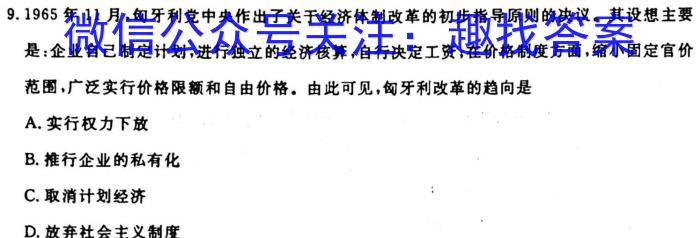 9.1965年11月,匈牙利作出了关于经济体制改革的初步指导原则的决议。其设想主要是:企业自己制定计划,进行独立的经济核算,自行决定工资;在价格制度方面,缩小固定官价范围,广泛实行价格限额和自由价格。由此可见,匈牙利改革的趋向是A.实行权力下放B.推行企业的私有化C.取消计划经济D.放弃社会主义制度