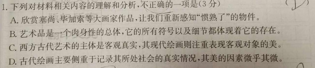 1.下列对材料相关内容的理解和分析,不正确的一项是(3分)(DA.欣赏塞尚、毕加索等大画家作品,让我们重新感知“惯熟了”的物件。B.艺术品是一个肉身性的总体,它的所有符号以及细节都体现着它的存在。C.西方古代艺术的主体是客观真实,其现代绘画则注重表现客观对象的美。D.古代绘画主要侧重于记录其所处社会的真实情况,其美的因素微乎其微。