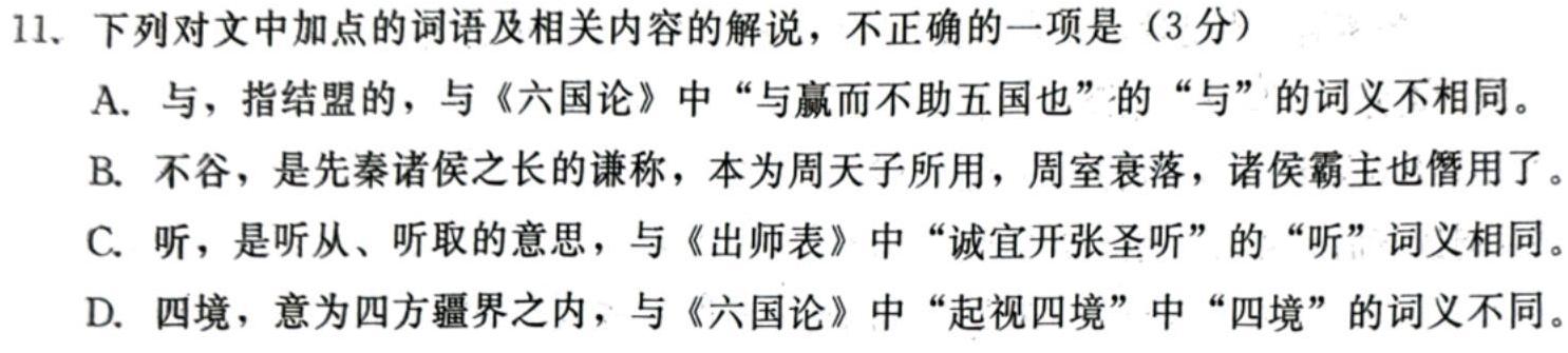 11.下列对文中加点的词语及相关内容的解说,不正确的一项是(3分)A.与,指结盟的,与《六国论》中“与赢而不助五国也”的“与”的词义不相同。B.不谷,是先秦诸侯之长的谦称,本为周天子所用,周室衰落,诸侯霸主也僭用了。C.听,是听从、听取的意思,与《出师表》中“诚宜开张圣听”的“听”词义相同。D.四境,意为四方疆界之内,与《六国论》中“起视四境”中“四境”的词义不同。