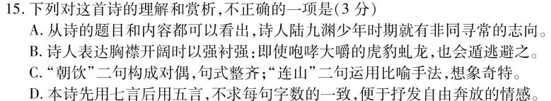 15.下列对这首诗的理解和赏析,不正确的一项是(3分)A.从诗的题目和内容都可以看出,诗人陆九渊少年时期就有非同寻常的志向。B.诗人表达胸襟开阔时以强衬强:即使咆哮大嚼的虎豹虬龙,也会遁逃避之。C.“朝饮”二句构成对偶,句式整齐;“连山”二句运用比喻手法,想象奇特。D.本诗先用七言后用五言,不求每句字数的一致,便于抒发自由奔放的情感。