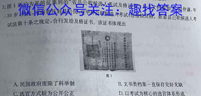 7.图1所示为某馆征集到的“省县公职候选人考试及格证书”,其正文内容如下:刘仲谦,年兼,年38岁,男性,河南省开封县公民,应甲种公职候选人考试,经检核及格。依省县公职候选人考试法第十条之规定,合行发给及格证书,该证书体现出图1A.民国政府废除了科举制B.文书类档案一直保存完好无缺C.选官方式较为公开公正D.以考试为核心的选官体系形成