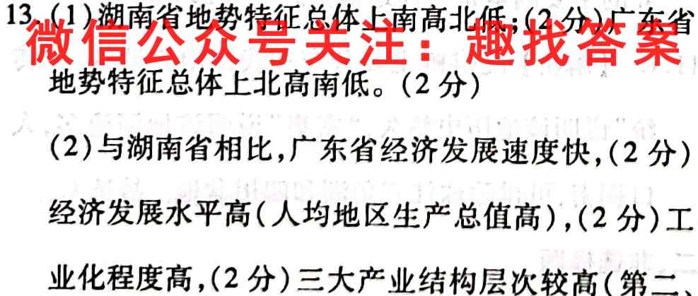 13.(1)湖南省地势特征总体上南高北低;(2分)广东省地势特征总体上北高南低。(2分) (2)与湖南省相比,广东省经济发展速度快,(2分)经济发展水平高(人均地区生产总值高),(2分)工业化程度高,(2分)三大产业结构层次较高(第二、 三产业比重大)。(2分) 或:与广东省相比,湖南省经济发展速度慢,(2分)经济发展水平低(人均地区生产总值低),(2分)工业化程度低,(2分)三大产业结构层次较低(第二、三产业比重小)。(2分) (3)湖南省有丰富的有色金属资源,煤炭、水能等能源资源丰富,可为广东省提供原料和能源;(3分)广东省可为湖南省提供资金、技术;(2分)湖南省可承接广东省部分产业的转移;(2分)湖南省和广东省可共同培育品牌,共同建立销售网络,开拓国内外市场。(2分) 【解析】第(1)题,由湖南省地图中河流大多由南向北流可知,湖南省地势南高北低;而由广东省地图中河流大多由北向南注入海洋可知,广东省地势北高南低。第(2)题,由地区生产总值的变化可看出经济发展速度,由人均地区生产总值可看出两省经济发展水平,广东省经济发展速度快,经济发展水平高(人均地区生产总值高);由第二产业比重可看出工业化程度,广东省工业化程度高;由第一、二、三产业比重可看出三大产业结构层次,广东省第二、三产业比重大,三大产业结构层次较高。第(3)题,由材料可知,湖南省具有资源优势,广东省具有资金、技术优势,然后根据两地的优势,分析两地应如何合作发展即可。