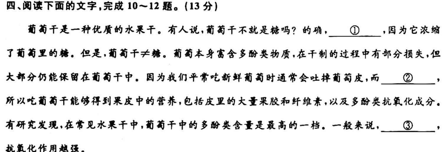 四、阅读下面的文字,完成10~12题。(13分)葡萄干是一种优质的水果干。有人说,葡萄干不就是糖吗?的确,①,因为它浓缩了葡萄里的糖。但是,葡萄干≠糖。葡萄本身富含多酚类物质,在干制的过程中有部分损失,但大部分仍能保留在葡萄干中。因为我们平常吃新鲜葡萄时通常会吐掉葡萄皮,而②,所以吃葡萄干能够得到果皮中的营养,包括皮里的大量果胶和纤维素,以及多酚类抗氧化成分。有研究发现,在常见水果干中,葡萄干中的多酚类含量是最高的一档。一般来说,③,抗氧化作用越强。