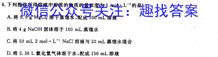 6.下列操作所得溶液中溶质的物质的量浓度为1molL^-A.将9.5gMgCl2溶于蒸馏水,配成100mL溶液B.将4gNaOH固体溶于100mL蒸馏水C.将50mL2molL^-1NaCl溶液与50mL蒸馏水混合D.将3.36L氯化氢气体溶于水,配成150mL溶液