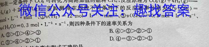 CO27.已知在一定条件下CO可转化为高附加值的燃料CH,反应原理为CO(g)+4H:(g)CH4,CH4(g)+2H2O(g)。CO2(g)+4H2(g)CH(g)+2HO(g)。实验测得在四种不同条件下的反应速率分别为①v(CO)=1v(CO2)=2molL^-1^-1,2v(H2)=12molL^-1^-1,3(NH4)=0.2molL^-1e^-12mol·L’·min、②v(H)=12mol·L·min、③v(CH)=0.2mol·L’·s4v(H2O)=0.3molL^-1s^-1,v(H:O)=0.3mol·L·s,则四种条件下的速率关系为A.②>①>④>③A.②①④③B.④③②①①C.③④②>①C.③④②①D.④=③②①