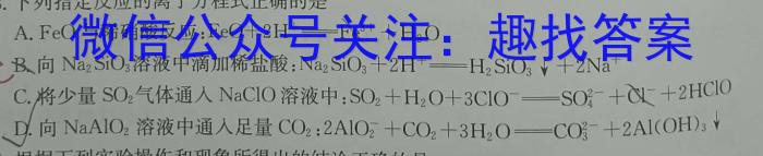 8.下列指定反应的离子方程式正确的是A.FeO与稀硝酸反应:FeO+2H^+Fe^3++H2OB.向Na2SiO3溶液中滴加稀盐酸:Na2SiO3+2H^+H2SiO3+2Na^+C.将少量SO2气体通入NaClO溶液中:+2HClOSO2+H2O+3ClO^-SO4^2-+Cl^-+2HClONaAlO2D.向NaAlO溶液中通入足量CO:2AlO+CO+3HO—CO+2AlOH):VCO2:2AlO2^-+CO2+3H2OCO3^2-+2Al(OH)3