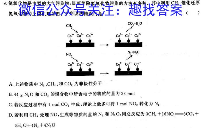 9.氮氧化物是主要的大气污染物,目前消除氮氧化物污染的方法有多种。其中利用CH4催化还原氮氧化物的反应机理如图。下列说法错误的是()A.上述物质中N2、CH4、和CO2为非极性分子B.44gN2O和CO2的混合物中所含电子的物质的量为22molC.若反应过程中有1molCO2生成,理论上最多可将1molNO2转化为N2D.若利用CH4处理NO,,生成等物质的量的N2和N2O,,则总反应为3CH4+16NO3CO2+6H2O+4N2+4N2O