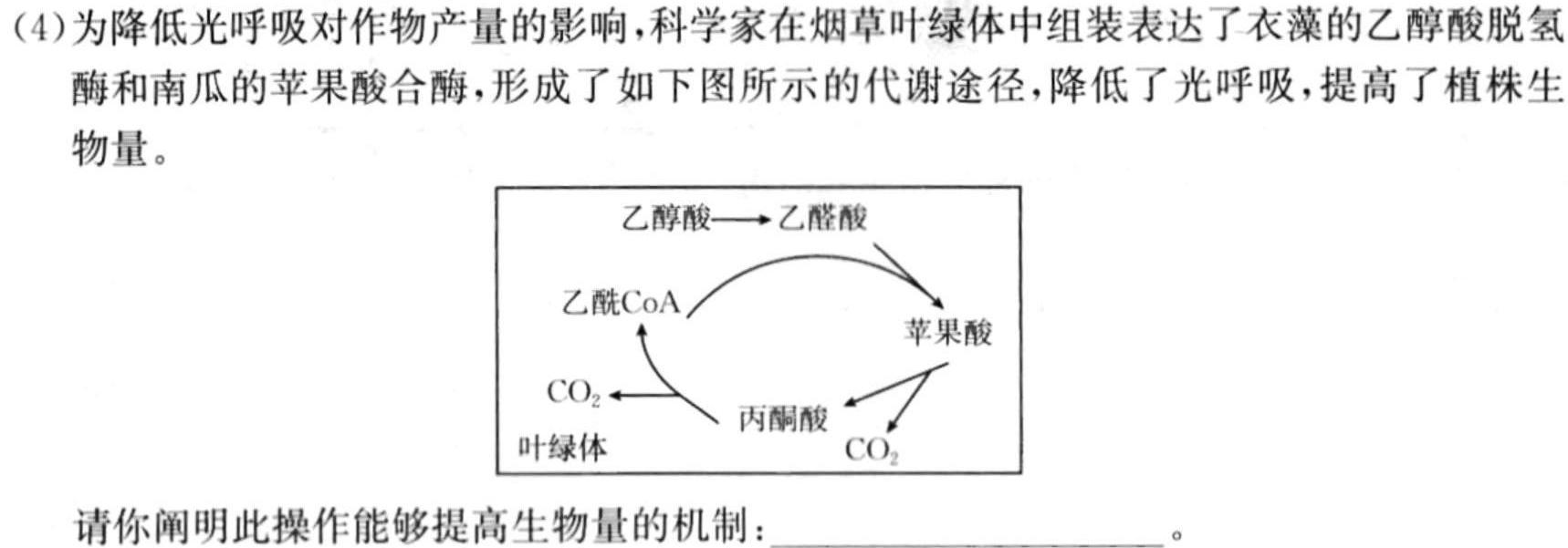 (4)为降低光呼吸对作物产量的影响,科学家在烟草叶绿体中组装表达了衣藻的乙醇酸脱氢酶和南瓜的苹果酸合酶,形成了如下图所示的代谢途径,降低了光呼吸,提高了植株生物量。请你阐明此操作能够提高生物量的机制:。