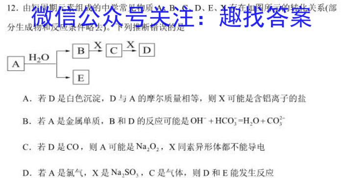 12.由短周期元素组成的中学常见物质A、B、C、D、E、X存在如图所示的转化关系(部分生成物和反应条件略去)。下列推断错误的是A.若D是白色沉淀,D与A的摩尔质量相等,则X可能是含铝离子的盐B.若A是金属单质,B和D的反应可能是OH^-+HCO3^-H2O+CO3^2-C.若D是CO,则A可能是Na2O2,X同素异形体都不能导电D.若A是氯气,X是Na2SO3,C是气体,则D和E能发生反应
