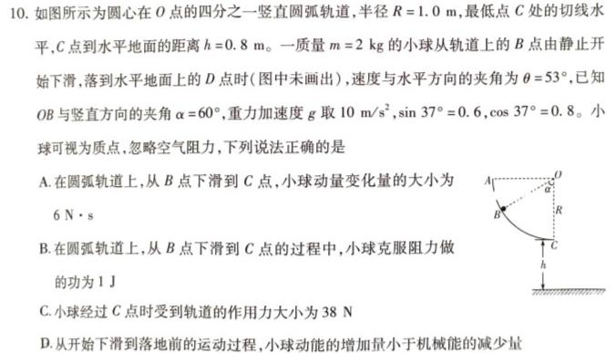 10.如图所示为圆心在0点的四分之一竖直圆弧轨道,半径R=1.0m,,最低点C处的切线水平,C点到水平地面的距离h=0.8m。。一质量m=2kg的小球从轨道上的B点由静止开始下滑,落到水平地面上的D点时(图中未画出),速度与水平方向的夹角为=53^,,已知OB与竖直方向的夹角=60^,,重力加速度g取10m/s^2,37^=0.6,37^=0.8。。小球可视为质点,忽略空气阻力,下列说法正确的是A.在圆弧轨道上,从B点下滑到C点,小球动量变化量的大小为6N·sB.在圆弧轨道上,从B点下滑到C点的过程中,小球克服阻力做的功为1JC.小球经过C点时受到轨道的作用力大小为38ND.从开始下滑到落地前的运动过程,小球动能的增加量小于机械能的减少量