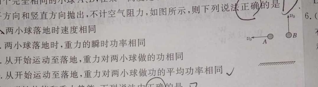 1.两个完全相同的小球A、B,在某一高度处以相同大小的初速度分别沿水平方向和竖直方向抛出,不计空气阻力,如图所示,则下列说法正确的是Dv0A.两小球落地时速度相同B.两小球落地时,重力的瞬时功率相同C.从开始运动至落地,重力对两小球做的功相同D.从开始运动至落地,重力对两小球做功的平均功率相同v0^-1BA
