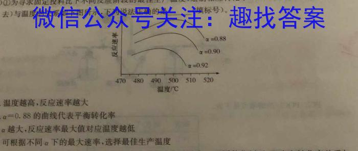 (2)①为寻求固定投料比下不同反应阶段的最佳生产温度,绘制相应转化率(a)下反应速率(数值已略去)与温度的关系如下图所示,下列说法正确的是(填标号)。a=0.88a=0.90a=0.92470480049050055105520温度//^Cd.可根据不同a.温度越高,反应速率越大b.a=0.88的曲线代表平衡转化率越大,反应速率最大值对应温度越低下的最大速率,选择最佳生产温度