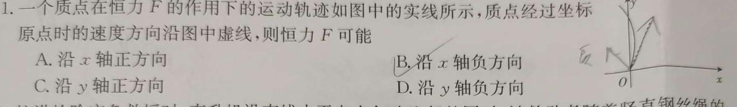 1.一个质点在恒力F的作用下的运动轨迹如图中的实线所示,质点经过坐标原点时的速度方向沿图中虚线,则恒力F可能A.沿x轴正方向B.沿x轴负方向C.沿y轴正方向D.沿y轴负方向