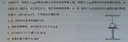 7.如图所示,质量为3kg的物体,1静止在竖直的轻弹簧上面,质量为2kg的物体,用细线悬挂起来,AB紧挨在一起但A、B之间无压力。某时刻将细线剪断,A、B一起向下运动的过程中(弹簧在弹性限度范围内,gg10m/s^2,下列说法正确的是()A.A、B组成的系统机械能守恒B.细线剪断瞬间,B对A的压力大小为8NC.B对A的压力大小最大为28ND.弹簧的最大弹力为60N