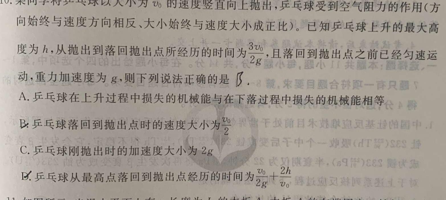 10.某同学将乒乓球以大小为v0的速度竖直向上抛出,乒乓球受到空气阻力的作用(方向始终与速度方向相反、大小始终与速度大小成正比)。已知乒乓球上升的最大高度为h,从抛出到落回抛出点所经历的时间为为3v02g,且落回到抛出点之前已经匀速运动,重力加速度为g,,则下列说法正确的是黄,来要目合球頁一育只蛋A.乒乓球在上升过程中损失的机械能与在下落过程中损失的机械能相等B:乒乓球落回到抛出点时的速度大小为变司干中个一C.乒乓球刚抛出时的加速度大小为2g(D.乒乓球从最高点落回到抛出点经历的时间为v02g+2hv0