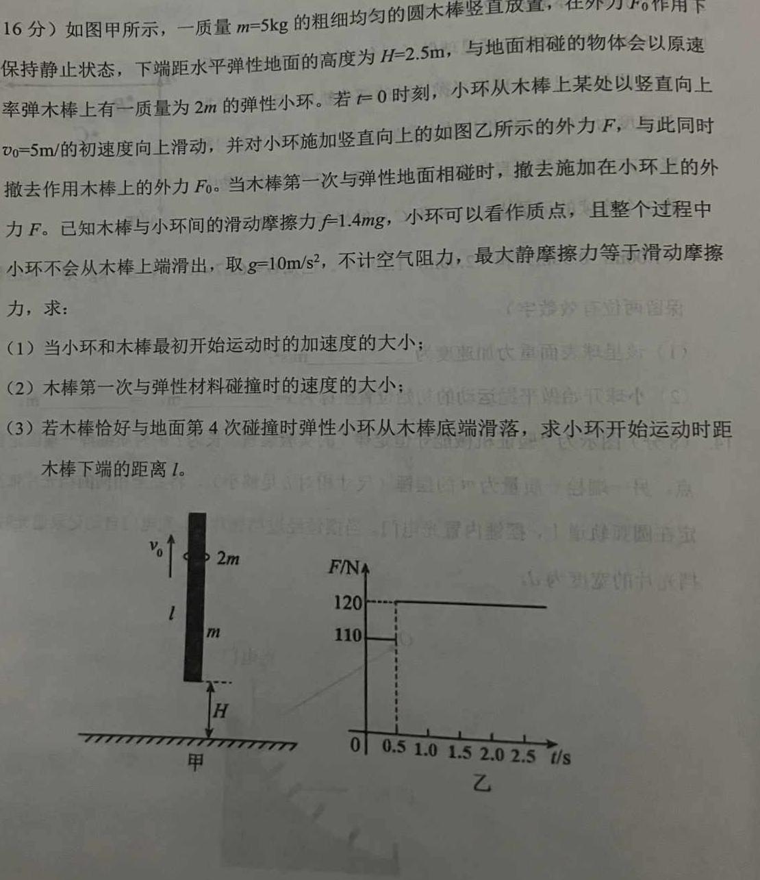 F018.(16分)如图甲所示,一质量m=5kg的粗细均匀的圆木棒竖直放置,在外力F作用下H=2.5m,保持静止状态,下端距水平弹性地面的高度为H=2.5m,与地面相碰的物体会以原速率弹木棒上有一质量为2m的弹性小环。若t=0时刻,小环从木棒上某处以竖直向上v0=5m//的初速度向上滑动,并对小环施加竖直向上的如图乙所示的外力F,与此同时撤去作用木棒上的外力F0。,当木棒第一次与弹性地面相碰时,撤去施加在小环上的外力F.已知木棒与小环间的滑动摩擦力f=1.4mg,,小环可以看作质点,且整个过程中小环不会从木棒上端滑出,取g=10m/s^2,不计空气阻力,最大静摩擦力等于滑动摩擦力,求:(1)当小环和木棒最初开始运动时的加速度的大小:(2)木棒第一次与弹性材料碰撞时的速度的大小:(3)若木棒恰好与地面第4次碰撞时弹性小环从木棒底端滑落,求小环开始运动时距木棒下端的距离1。