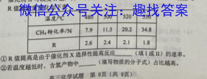 (5)催化剂X可改变R值,另一时段内CH4转化率、R值随温度变化如下表①R值提高是由于催化剂X选择性提高反应②若温度越低时,含氢产物中(填写物质的分子式)占比越高。高三化学试题第8页(共9页)