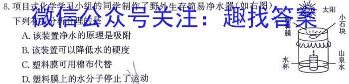 8.项目式化学学习小组的同学制作了野外生存简易净水器(如右图),下列有关分析合理的是()A.该装置净水的原理是吸附B.该装置可以降低水的硬度C.塑料膜可用棉布代替D.塑料膜上的水分子停止了运动