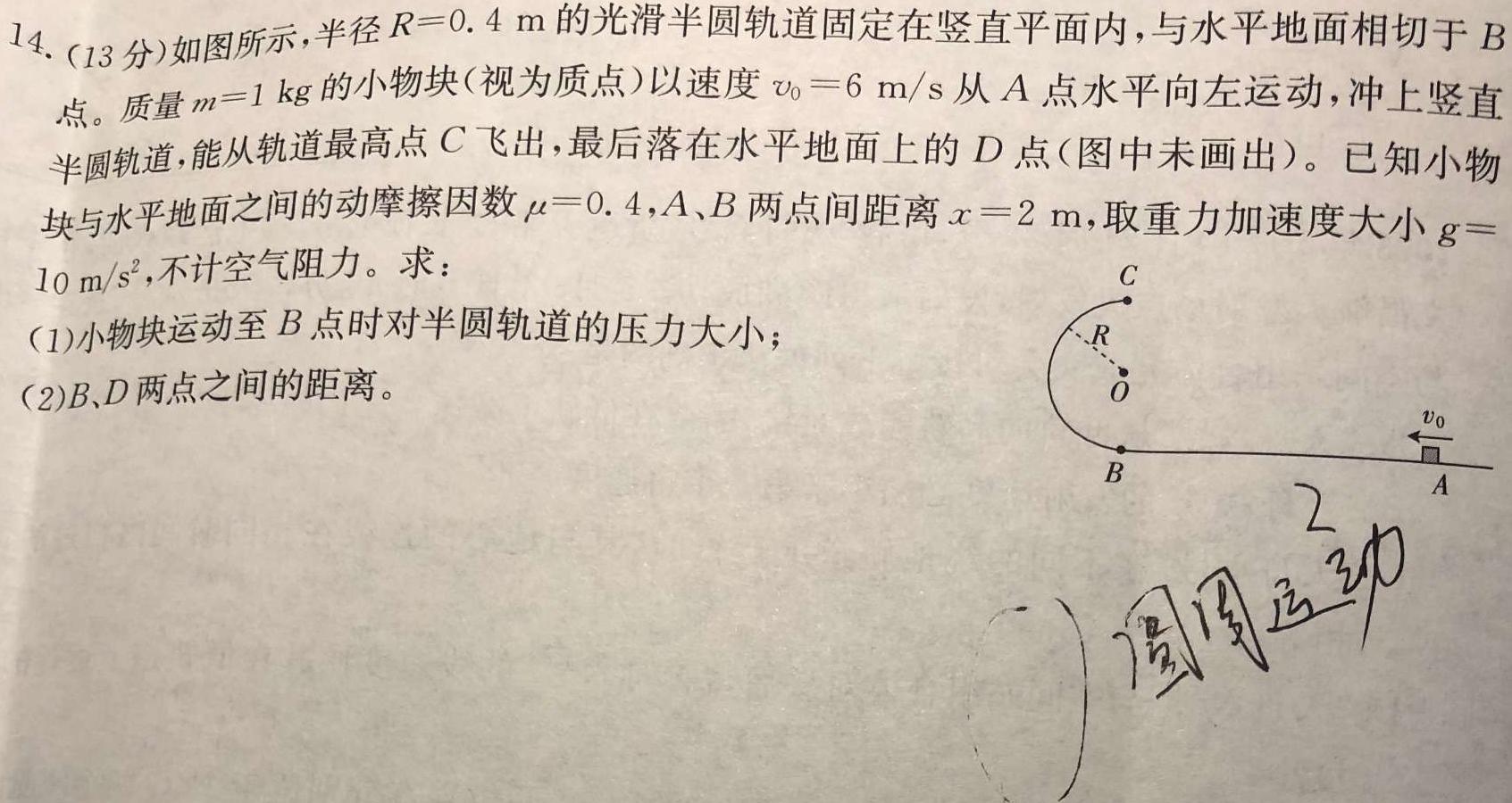 14.(13分)如图所示,半径R=0.4m的光滑半圆轨道固定在竖直平面内,与水平地面相切于B点。质量m=1kg的小物块(视为质点)以速度v0=6m/s从A点水平向左运动,冲上竖直半圆轨道,C半圆轨道,能从轨道最高点C飞出,最后落在水平地面上的D点(图中=0.4,A、B块与水平地面之间的动摩擦因数μ=0.4,A、B两点间距离x=2m,取重力加速度大小g=x=2m,10m/s^2,,不计空气阻力。求:(2)B、D(1)小物块运动至B点时对半圆轨道的压力大小;(2)B、D两点之间的距离。