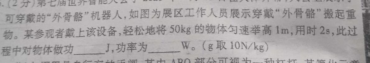 16.(2分)第七届世界智能大会于2023年5月18日在天津开幕,大会上展示了可穿戴的“外骨骼”机器人,如图为展区工作人员展示穿戴“外骨骼”搬起黄物。某参观者戴上该设备,轻松地将50kg的物体匀速举高1m,用时2s.此过程中对物体做功J,功率为W。(g取10N/kg)