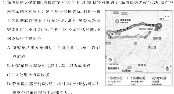 1.淄博烧烤火爆出圈,淄博市在2023年10月29日特别策划了“淄博烧烤之夜”活动,家在济南的某同学和家人计划自驾去淄博游玩,利用手机上的地图软件搜索了行车路线,如图,按提示路线需要用时1小时24分,行程113公里到达淄博,下列说法中正确的是A.研究车从出发至到达目的地的时间,车可以看成质点B.研究车停入车位的过程中,车可以看成质点C.113公里指的是位移D.若按提示路线行驶,经1小时24分到达,可以计算整个行车过程的平均速度大小