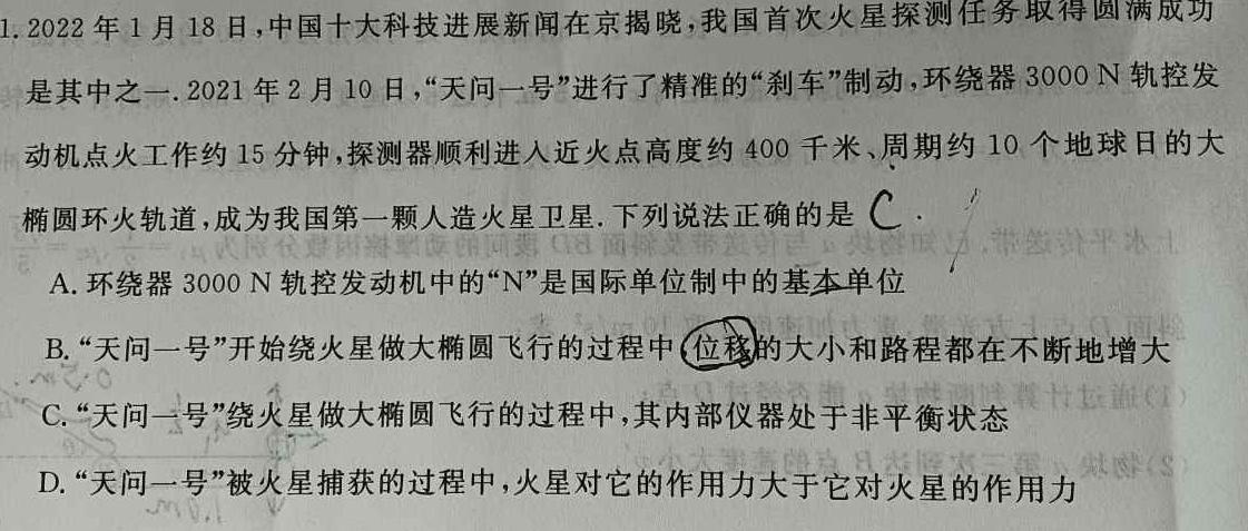 1.2022年1月18日,中国十大科技进展新闻在京揭晓,我国首次火星探测任务取得圆满成功是其中之一.2021年2月10日,“天问一号”进行了精准的“刹车”制动,环绕器33000N轨控发动机点火工作约15分钟,探测器顺利进入近火点高度约400千米、周期约10个地球日的大椭圆环火轨道,成为我国第一颗人造火星卫星.下列说法正确的是CA.环绕器3000N轨控发动机中的“N”是国际单位制中的基本单位B.“天问一号”开始绕火星做大椭圆飞行的过程中(位移的大小和路程都在不断地增大C.“天问一一号”绕火星做大椭圆飞行的过程中,其内部仪器处于非平衡状态D.“天问一号”被火星捕获的过程中,火星对它的作用力大于它对火星的作用力