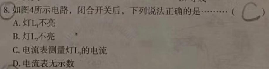 8.如图4所示电路,闭合开关后,下列说法正确的是………(CA.灯L1不亮B.灯L2不亮C.电流表测量灯L1的电流D.电流表无示数