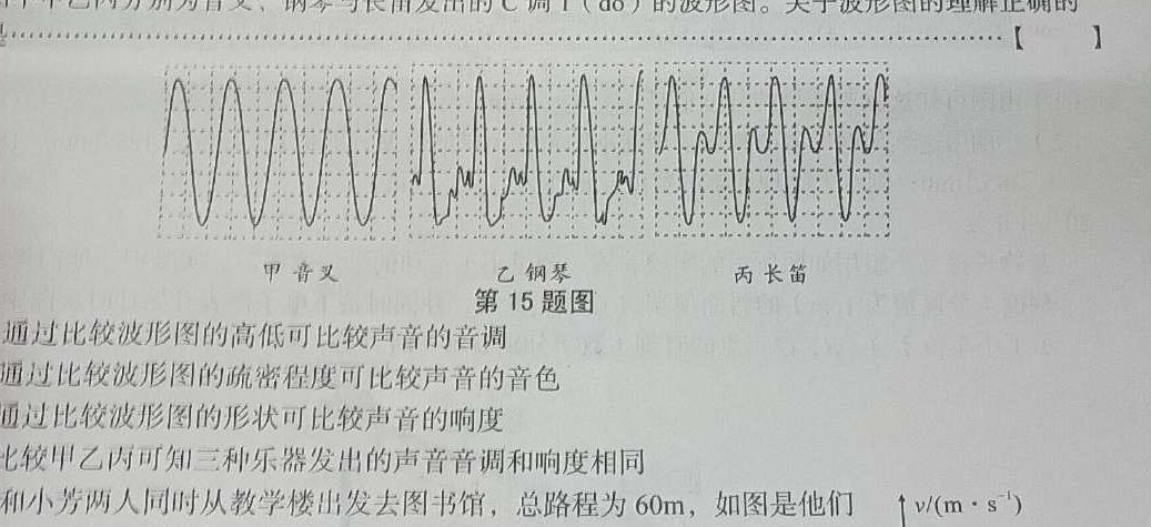 图中甲乙丙分别为音叉、钢琴与长笛发出的C调1(d.0)的波形图。关于波形图的理解正确的……………………..·【【】是……………通过比较波形图的高低可比较声音的音调强过比较波形图的疏密程度可比较声音的音色通过比较波形图的形状可比较声音的响度比较甲乙丙可知三种乐器发出的声音音调和响度相同v/(ms^-1)