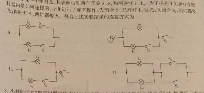 7.老师给小龙一个密封盒,其表面可见两个开关S和两盏灯LLa。为了探究开关和灯在密S1、S2L1、L20封盒内是如何连接的,小龙进行了如下操作:先闭合5,只有灯L发光;又闭合S,.两灯都发S1,L1S2,S1,光;再断开S,两灯都熄灭。符合上述实验结果的连接方式为