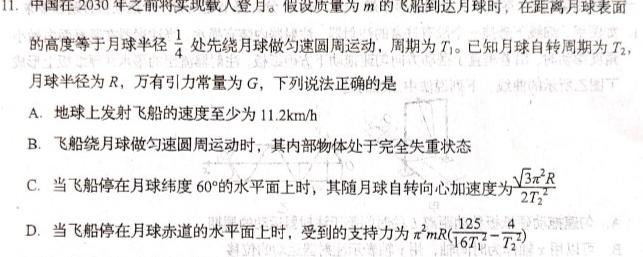 11.中国在2030年之前将实现载人登月。假设质量为的飞船到达月球时,在距离月球表面的高度等于月球半径片处先绕月球做匀速圆周运动,周期为,T10,已知月球自转周期为T2,月球半径为R,万有引力常量为G,下列说法正确的是A.地球上发射飞船的速度至少为11.2km/hB.飞船绕月球做匀速圆周运动时,其内部物体处于完全失重状态C.当飞船停在月球纬度60^的水平面上时,其随月球自转向心加速度为3^2R2T2^2D.当飞船停在月球赤道的水平面上时,受到的支持力为^2mR(12516T1^2-4T2^2)