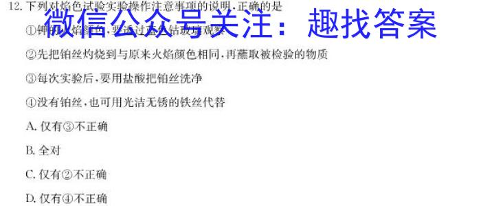 12.下列对焰色试验实验操作注意事项的说明,正确的是①钾的火焰颜色,要透过蓝色钴玻璃观察②先把铂丝灼烧到与原来火焰颜色相同,再蘸取被检验的物质③每次实验后,要用盐酸把铂丝洗净④没有铂丝,也可用光洁无锈的铁丝代替A.仅有③不正确B.全对C.仅有②不正确D.仅有④不正确