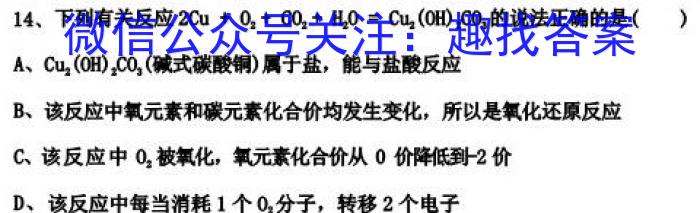 14、下列有关反应2Cu+O2+CO2+H2OCu2(OH)2CO3的说法正确的是()A、Cu2(OH)2CO3(碱式碳酸铜)属于盐,能与盐酸反应B、该反应中氧元素和碳元素化合价均发生变化,所以是氧化还原反应C、该反应中O2被氧化,氧元素化合价从0价降低到-2价D、该反应中每当消耗1个O2分子,转移2个电子