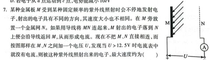 7.某种金属板M受到某种固定频率的紫外线照射时会不停地发射电子,射出的电子具有不同的方向,其速度大小也不相同。在M旁放置一个金属网N0如果用导线将MN连起来,M射出的电子落到N上便会沿导线返回M,从而形成电流。现在不把M、N直接相连,而按图那样在M、N之间加一个电压U,发现当U>12.5V时电流表中就没有电流,则被这种紫外线照射出来的电子,最大速度约为()
