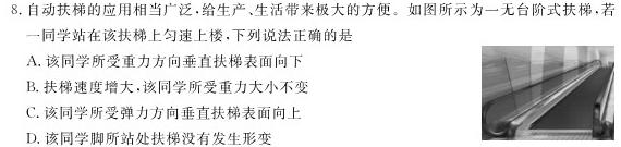 8.自动扶梯的应用相当广泛,给生产、生活带来极大的方便。如图所示为一无台阶式扶梯,若一同学站在该扶梯上匀速上楼,下列说法正确的是A.该同学所受重力方向垂直扶梯表面向下B.扶梯速度增大,该同学所受重力大小不变C.该同学所受弹力方向垂直扶梯表面向上D.该同学脚所站处扶梯没有发生形变