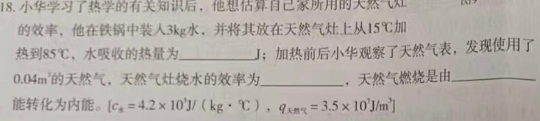 18.小华学习了热学的有关知识后,他想估算自己家所用的天然气灶的效率,他在铁锅中装人3kg水,并将其放在天然气灶上从15^C加热到85℃,水吸收的热量为J;加热前后小华观察了天然气表,发现使用了85^C,0.04m^3的天然气,天然气灶烧水的效率为,天然气燃烧是,天然气燃烧是由能转化为内能。[c8=4.210^3J/(kg^C),q55=3.510^7J/m^3)