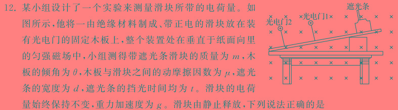 12.某小组设计了一个实验来测量滑块所带的电荷量。如图所示,他将一由绝缘材料制成、带正电的滑块放在装有光电门的固定木板上,整个装置处在垂直于纸面向里的匀强磁场中,小组测得带遮光条滑块的质量为m,,木板的倾角为0,木板与滑块之间的动摩擦因数为,,遮光条的宽度为d,,遮光条的挡光时间均为t0,滑块的电荷量始终保持不变,重力加速度为g。。滑块由静止释放,下列说法正确的是A.到达光电门2之前滑块先加速后减速B.到达光电门2之前滑块所受的摩擦力先增大后不变C.滑块所带的电荷量为的电荷量为D.若滑块带负电,仅调整滑块到光电门1的距离并由静止释放,在滑块不脱离斜面的情况下,可使遮光条的挡光时间相等