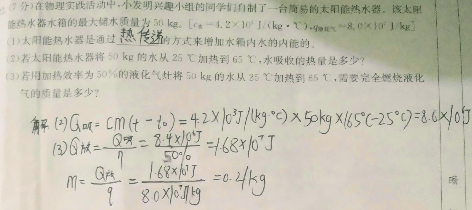 (7分)在物理实践活动中,小发明兴趣小组的同学们自制了一台简易的太阳能热水器。该太阳能热水器水箱的最大储水质量为50kg。[cx=4.2×10°J/(kg·℃),50kg.[c水=4.210^3J/(kg^C),q水=12010^7J/kgg,4液化气=8.0×10J/kg](1)太阳能热水器是通过热传递的方式来增加水箱内水的内能的。(2)若太阳能热水器将50kg的水从25^C加热到65^C,水吸收的热量是多少?(3)若用加热效率为50%的液化气灶将50kg的水从25^C加热到65^C,需要完全燃烧液化气的质量是多少?