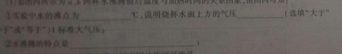 (3)如图丙所示为n两杯水沸腾前后温度与加热时间的关系图象,由图丙可知:①实实中水的沸点为^∘C,,说明烧杯水面上方的气压(选填“大于小于”等于”)1标准大气压,②水沸的特点是;