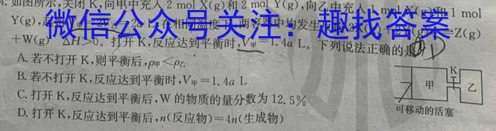 14.4.如图所示,关闭K,,向甲中充入2molX(g)和2molY(g),,向乙中充入1molX(g)和1molY(g),,起始V甲=2V乙=2aL,,在相同温度下,两容器中均发生反应2X(g)+2Y(g)Z(g)+W(g)△H>0。△H>0。打开K,反应达到平衡时,V甲=1.4aL。,V=1.4aL。下列说法正确的是DA.若不打开K,则平衡后,,p甲<乙B.若不打开K,反应达到平衡时,V甲=1.4aLC.打开K,反应达到平衡后,W的物质的量分数为12.5%D.打开K,反应达到平衡后,n(反应物.)=4n(生成物)K甲乙可移动的活塞