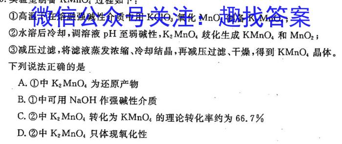 5.实验室制备KMnO4过程如下:①高温下在熔融强碱性介质中用KClO3氧化MnO2制备K2MnO4;②水溶后冷却,调溶液pH至弱碱性,K2MnO4歧化生成KMnO4和MnO2;③减压过滤,将滤液蒸发浓缩、冷却结晶,再减压过滤、干燥,得到KMnO4晶体。下列说法正确的是A.①中K2MnO4为还原产物B.①中可用NaOH作强碱性介质C.②中K2MnO4转化为KMnO4的理论转化率约为66.7%D.②中K2MnO4只体现氧化性