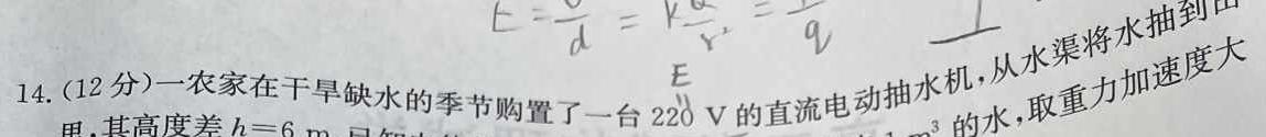 d=19E14.(12分)一农家在干旱缺水的季节购置了一台220度大,的直流电动抽水机,从水渠将水抽到里,其高度差h=6m,已知电能的20%用于抽水,每分钟可抽出1m的水,取重力加速度大h=6m,20%用于抽水,每分钟抽出1m^3的的20