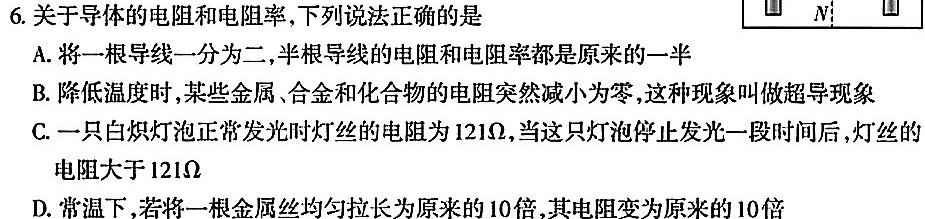 6.关于导体的电阻和电阻率,下列说法正确的是A.将一根导线一分为二,半根导线的电阻和电阻率都是原来的一半B.降低温度时,某些金属、合金和化合物的电阻突然减小为零,这种现象叫做超导现象C.一只白炽灯泡正常发光时灯丝的电阻为121Ω,当这只灯泡停止发光一段时间后,灯丝的电阻大于121ΩD.常温下,若将一根金属丝均匀拉长为原来的10倍,其电阻变为原来的10倍