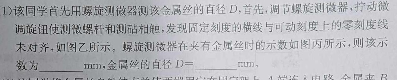 (1)该同学首先用螺旋测微器测该金属丝的直径D,首先,调节螺旋测微器,拧动微调旋钮使测微螺杆和测砧相触,发现固定刻度的横线与可动刻度上的零刻度线未对齐,如图乙所示。螺旋测微器在夹有金属丝时的示数如图丙所示,则该示数为mm,金属丝的直径D=mm。