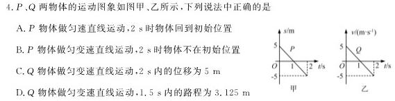 4.P、Q两物体的运动图象如图甲、乙所示,下列说法中正确的是A.P物体做匀速直线运动,2s时物体回到初始位置B.P物体做匀变速直线运动,2s时物体不在初始位置C.Q物体做匀变速直线运动,2s内的位移为5mD.Q物体做匀变速直线运动,1.5s内的路程为3.125m