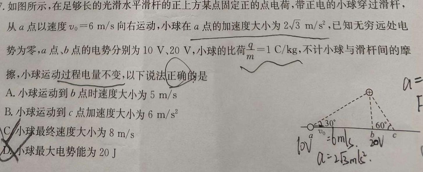 7.如图所示,在足够长的光滑水平滑杆的正上方某点固定正的点电荷,带正电的小球穿过滑杆,从a点以速度v0=6m/ss向右运动,小球在a点的加速度大小为23m/s^2,,已知无穷远处电势为零,a点、b点的电势分别为10V、20V,小球的比荷qm=1C/kg,不计小球与滑杆间的摩擦,小球运动过程电量不变,以下说法正确的是a=A.小球运动到b点时速度大小为5m/sB.小球运动到c点加速度大小为6m/s^2C.小球最终速度大小为8m/sD.小球最大电势能为20J