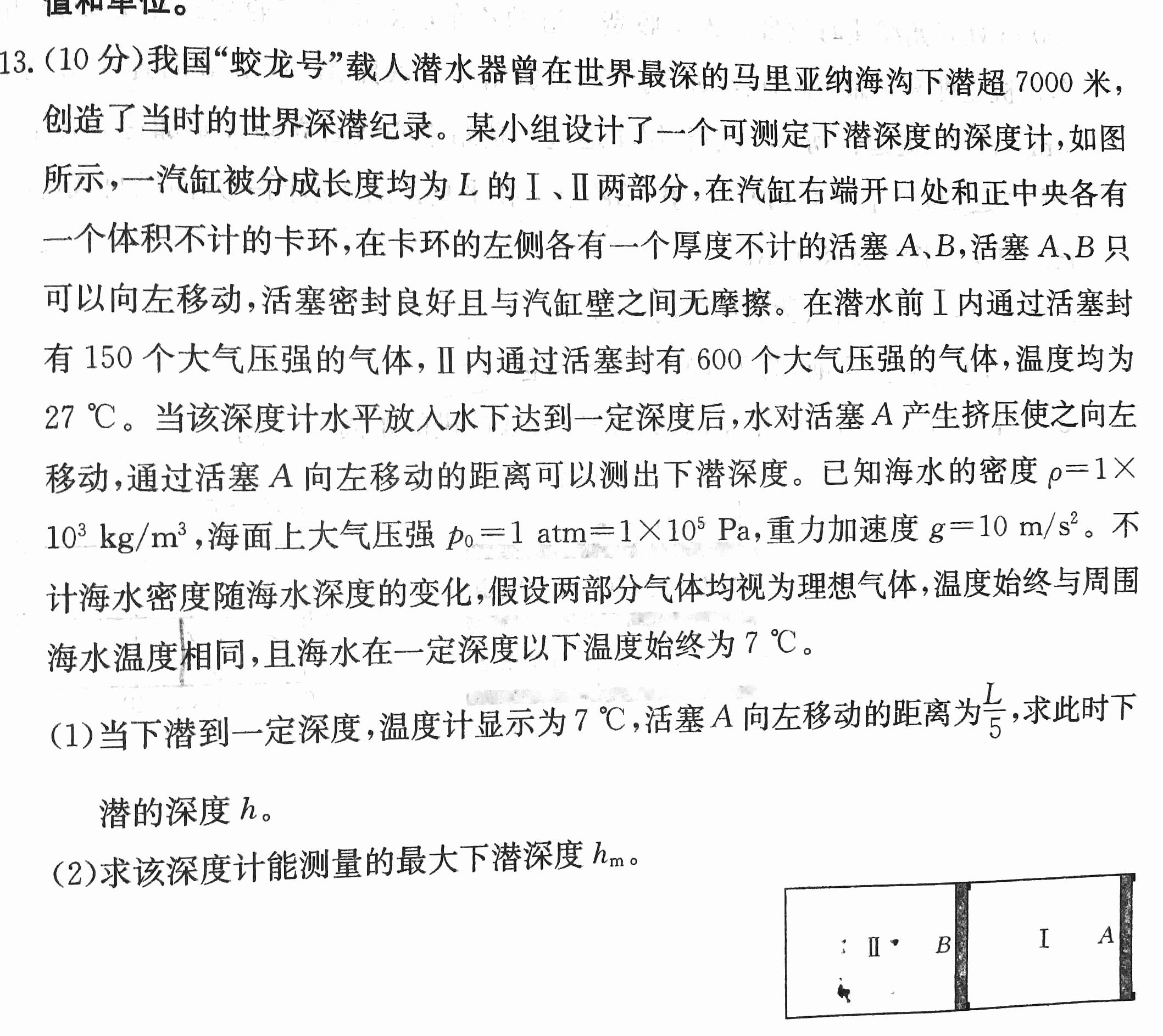 13.(10分)我国“蛟龙号”载人潜水器曾在世界最深的马里亚纳海沟下潜超7000米创造了当时的世界深潜纪录。某小组设计了一个可测定下潜深度的深度计,如图所示,一汽缸被分成长度均为L的I、Ⅱ两部分,在汽缸右端开口处和正中央各有一个体积不计的卡环,在卡环的左侧各有一个厚度不计的活塞A、B,活塞A、B只可以向左移动,活塞密封良好且与汽缸壁之间无摩擦。在潜水前I内通过活塞封有150个大气压强的气体,内通过活塞封有600个大气压强的气体,温度均为27^C。,当该深度计水平放入水下达到一定深度后,水对活塞A产生挤压使之向左移动,通过活塞A向左移动的距离可以测出下潜深度。已知海水的密度ρ=1×10^3kg/m^3,海面上大气压强p0=1atm=110^5Pa,重力加速度g=10m/s^2。计海水密度随海水深度的变化,假设两部分气体均视为理想气体,温度始终与周围海水温度相同,且海水在一定深度以下温度始终为7^C(1)当下潜到一定深度,温度计显示为7^C,活塞A向左移动的距离为L5,,求此时下潜的深度(2)求该深度计能测量的最大下潜深度hm。