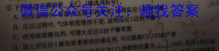①下列说法正确的是BD(填选项标号)。A.反应过程中,容器内压强不再变化,说明反应I达到平衡平衡0.9B.反应过程中,气体密度维持不变,说明反应I达到32.1数C.改用高效催高效催化剂,可增大反应Ⅱ的平衡常数.2果更佳的催化剂,可以提高CH3OHH,OH的产率5x