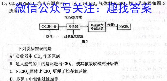 15.ClO2和NaClO2均具有漂白性,工业上用ClO2气体制NaClO2的工艺流程如图5所示:下列说法错误的是A.吸收器中ClO2作还原剂B.通入空气的目的是驱赶出ClO2,使其被吸收器充分吸收C.NaClO2固体比ClO2,更便于贮存和运输D.步骤a中包含过滤操作