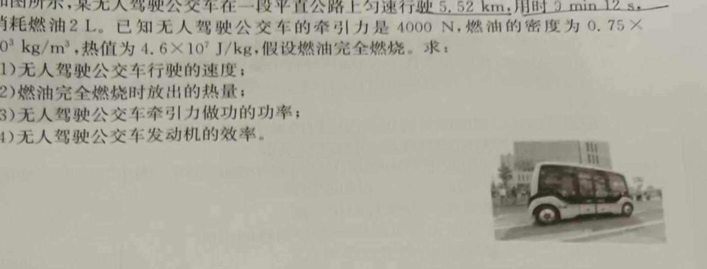 17.如图所示,某无人驾驶公交车在一段平直公路上匀速行驶5.52km,用时消耗燃油2L。in1210^3kg/m^3,,已知无人驾驶公交车的牵引力是4000N,燃油的密度为0.75×热值为4.610^7J/kg,假设燃油完全燃烧。求(2)燃油完全燃烧时放出的热量;(3)无人驾驶公交车牵引力做功的功率;(4)无人驾驶公交车发动机的效率。